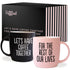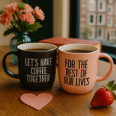 Set of two ceramic mugs: matte black with “Let’s Have Coffee Together” and soft pink with “For the Rest of Our Lives.” Modern typography with a romantic twist. Dishwasher and microwave safe. Comes in a matching gift box.