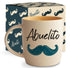 Cream-colored ceramic mug with a warm yellow interior. Features the word “Abuelito” in playful script and a bold teal mustache illustration. Comes in a matching mustache-patterned gift box.