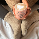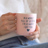 Pink ceramic mug with white interior and the message: “In a world full of sisters, I’m so happy I got you.” Includes a soft pair of cream-colored cozy socks. Comes in a coordinating gift box with a modern, sweet design.