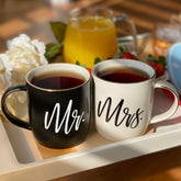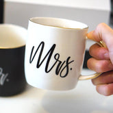 A striking black and white “Mr.” and “Mrs.” ceramic mug set, featuring elegant gold detailing on the rims and handles.